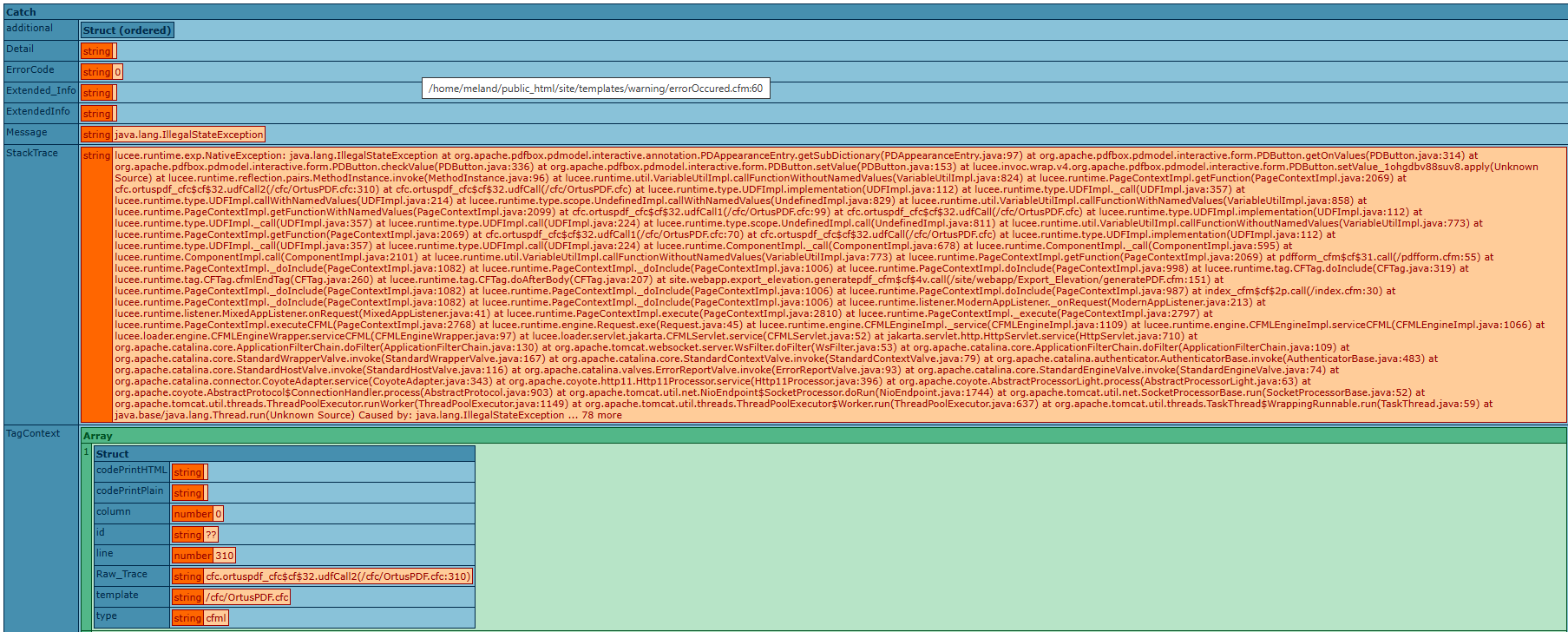 lucee.runtime.exp.NativeException: java.lang.IllegalStateException at org.apache.pdfbox.pdmodel.interactive.annotation.PDAppearanceEntry.getSubDictionary(PDAppearanceEntry.java:97) at org.apache.pdfbox.pdmodel.interactive.form.PDButton.getOnValues(PDButton.java:314) at org.apache.pdfbox.pdmodel.interactive.form.PDButton.checkValue(PDButton.java:336) at org.apache.pdfbox.pdmodel.interactive.form.PDButton.setValue(PDButton.java:153) at lucee.invoc.wrap.v4.org.apache.pdfbox.pdmodel.interactive.form.PDButton.setValue_1ohgdbv88suv8.apply(Unknown Source) at lucee.runtime.reflection.pairs.MethodInstance.invoke(MethodInstance.java:96) at lucee.runtime.util.VariableUtilImpl.callFunctionWithoutNamedValues(VariableUtilImpl.java:824) at lucee.runtime.PageContextImpl.getFunction(PageContextImpl.java:2069) at cfc.ortuspdf_cfc$cf$9s.udfCall2(/cfc/OrtusPDF.cfc:310) at cfc.ortuspdf_cfc$cf$9s.udfCall(/cfc/OrtusPDF.cfc) at lucee.runtime.type.UDFImpl.implementation(UDFImpl.java:112) at lucee.runtime.type.UDFImpl._call(UDFImpl.java:357) at lucee.runtime.type.UDFImpl.callWithNamedValues(UDFImpl.java:214) at lucee.runtime.type.scope.UndefinedImpl.callWithNamedValues(UndefinedImpl.java:829) at lucee.runtime.util.VariableUtilImpl.callFunctionWithNamedValues(VariableUtilImpl.java:858) at lucee.runtime.PageContextImpl.getFunctionWithNamedValues(PageContextImpl.java:2099) at cfc.ortuspdf_cfc$cf$9s.udfCall1(/cfc/OrtusPDF.cfc:99) at cfc.ortuspdf_cfc$cf$9s.udfCall(/cfc/OrtusPDF.cfc) at lucee.runtime.type.UDFImpl.implementation(UDFImpl.java:112) at lucee.runtime.type.UDFImpl._call(UDFImpl.java:357) at lucee.runtime.type.UDFImpl.call(UDFImpl.java:224) at lucee.runtime.type.scope.UndefinedImpl.call(UndefinedImpl.java:811) at lucee.runtime.util.VariableUtilImpl.callFunctionWithoutNamedValues(VariableUtilImpl.java:773) at lucee.runtime.PageContextImpl.getFunction(PageContextImpl.java:2069) at cfc.ortuspdf_cfc$cf$9s.udfCall1(/cfc/OrtusPDF.cfc:70) at cfc.ortuspdf_cfc$cf$9s.udfCall(/cfc/OrtusPDF.cfc) at lucee.runtime.type.UDFImpl.implementation(UDFImpl.java:112) at lucee.runtime.type.UDFImpl._call(UDFImpl.java:357) at lucee.runtime.type.UDFImpl.call(UDFImpl.java:224) at lucee.runtime.ComponentImpl._call(ComponentImpl.java:678) at lucee.runtime.ComponentImpl._call(ComponentImpl.java:595) at lucee.runtime.ComponentImpl.call(ComponentImpl.java:2101) at lucee.runtime.util.VariableUtilImpl.callFunctionWithoutNamedValues(VariableUtilImpl.java:773) at lucee.runtime.PageContextImpl.getFunction(PageContextImpl.java:2069) at pdfform_cfm$cf$9r.call(/pdfform.cfm:55) at lucee.runtime.PageContextImpl._doInclude(PageContextImpl.java:1082) at lucee.runtime.PageContextImpl._doInclude(PageContextImpl.java:1006) at lucee.runtime.PageContextImpl.doInclude(PageContextImpl.java:998) at lucee.runtime.tag.CFTag.doInclude(CFTag.java:319) at lucee.runtime.tag.CFTag.cfmlEndTag(CFTag.java:260) at lucee.runtime.tag.CFTag.doAfterBody(CFTag.java:207) at site.webapp.export_elevation.generatepdf_cfm$cf$b1.call(/site/webapp/Export_Elevation/generatePDF.cfm:297) at lucee.runtime.PageContextImpl._doInclude(PageContextImpl.java:1082) at lucee.runtime.PageContextImpl._doInclude(PageContextImpl.java:1006) at lucee.runtime.PageContextImpl.doInclude(PageContextImpl.java:987) at index_cfm$cf$94.call(/index.cfm:30) at lucee.runtime.PageContextImpl._doInclude(PageContextImpl.java:1082) at lucee.runtime.PageContextImpl._doInclude(PageContextImpl.java:1006) at lucee.runtime.listener.ModernAppListener._onRequest(ModernAppListener.java:213) at lucee.runtime.listener.MixedAppListener.onRequest(MixedAppListener.java:41) at lucee.runtime.PageContextImpl.execute(PageContextImpl.java:2810) at lucee.runtime.PageContextImpl._execute(PageContextImpl.java:2797) at lucee.runtime.PageContextImpl.executeCFML(PageContextImpl.java:2768) at lucee.runtime.engine.Request.exe(Request.java:45) at lucee.runtime.engine.CFMLEngineImpl._service(CFMLEngineImpl.java:1109) at lucee.runtime.engine.CFMLEngineImpl.serviceCFML(CFMLEngineImpl.java:1066) at lucee.loader.engine.CFMLEngineWrapper.serviceCFML(CFMLEngineWrapper.java:97) at lucee.loader.servlet.jakarta.CFMLServlet.service(CFMLServlet.java:52) at jakarta.servlet.http.HttpServlet.service(HttpServlet.java:710) at org.apache.catalina.core.ApplicationFilterChain.doFilter(ApplicationFilterChain.java:130) at org.apache.tomcat.websocket.server.WsFilter.doFilter(WsFilter.java:53) at org.apache.catalina.core.ApplicationFilterChain.doFilter(ApplicationFilterChain.java:109) at org.apache.catalina.core.StandardWrapperValve.invoke(StandardWrapperValve.java:167) at org.apache.catalina.core.StandardContextValve.invoke(StandardContextValve.java:79) at org.apache.catalina.authenticator.AuthenticatorBase.invoke(AuthenticatorBase.java:483) at org.apache.catalina.core.StandardHostValve.invoke(StandardHostValve.java:116) at org.apache.catalina.valves.ErrorReportValve.invoke(ErrorReportValve.java:93) at org.apache.catalina.core.StandardEngineValve.invoke(StandardEngineValve.java:74) at org.apache.catalina.connector.CoyoteAdapter.service(CoyoteAdapter.java:343) at org.apache.coyote.http11.Http11Processor.service(Http11Processor.java:396) at org.apache.coyote.AbstractProcessorLight.process(AbstractProcessorLight.java:63) at org.apache.coyote.AbstractProtocol$ConnectionHandler.process(AbstractProtocol.java:903) at org.apache.tomcat.util.net.NioEndpoint$SocketProcessor.doRun(NioEndpoint.java:1744) at org.apache.tomcat.util.net.SocketProcessorBase.run(SocketProcessorBase.java:52) at org.apache.tomcat.util.threads.ThreadPoolExecutor.runWorker(ThreadPoolExecutor.java:1149) at org.apache.tomcat.util.threads.ThreadPoolExecutor$Worker.run(ThreadPoolExecutor.java:637) at org.apache.tomcat.util.threads.TaskThread$WrappingRunnable.run(TaskThread.java:59) at java.base/java.lang.Thread.run(Unknown Source) Caused by: java.lang.IllegalStateException ... 78 more